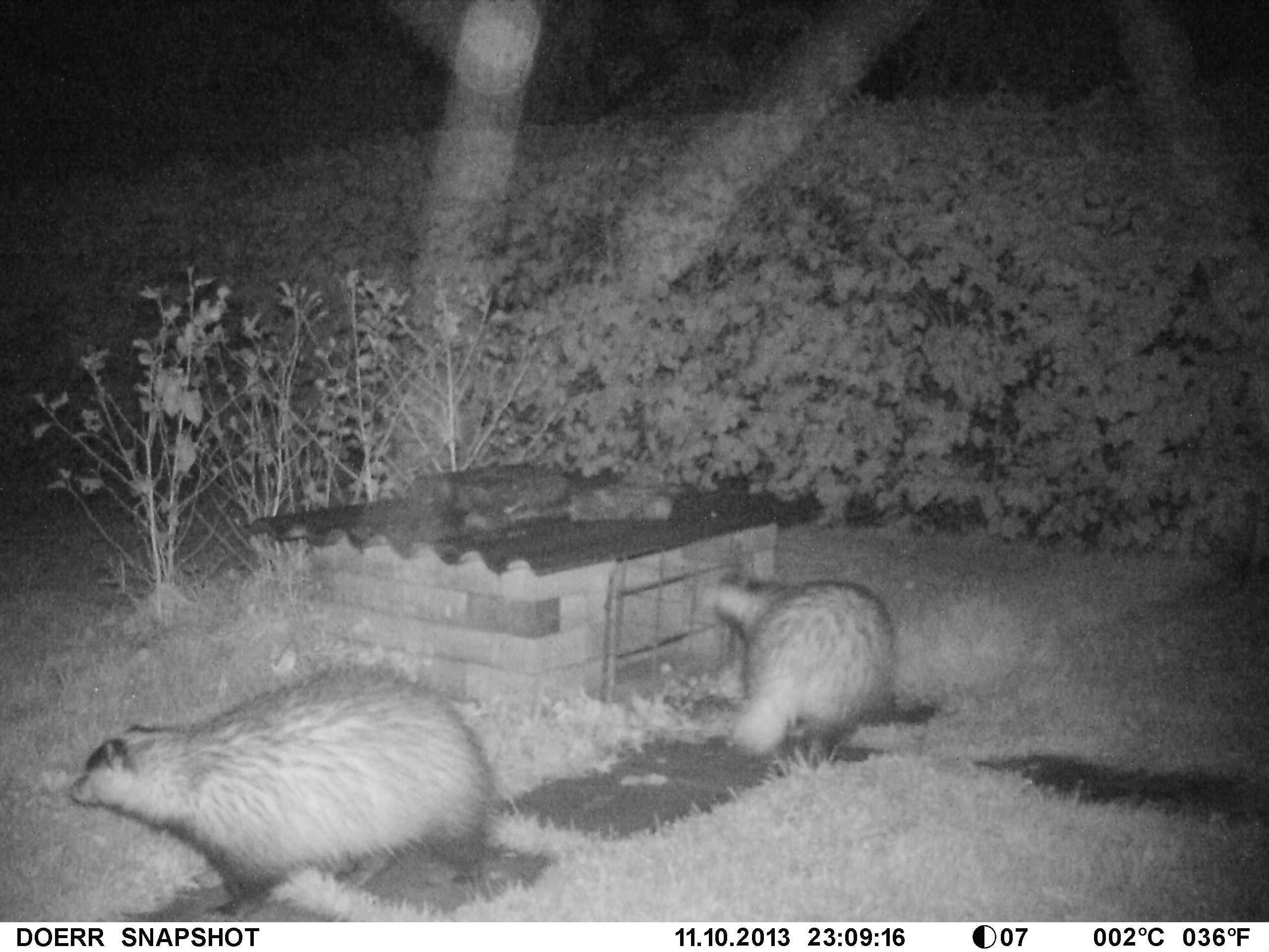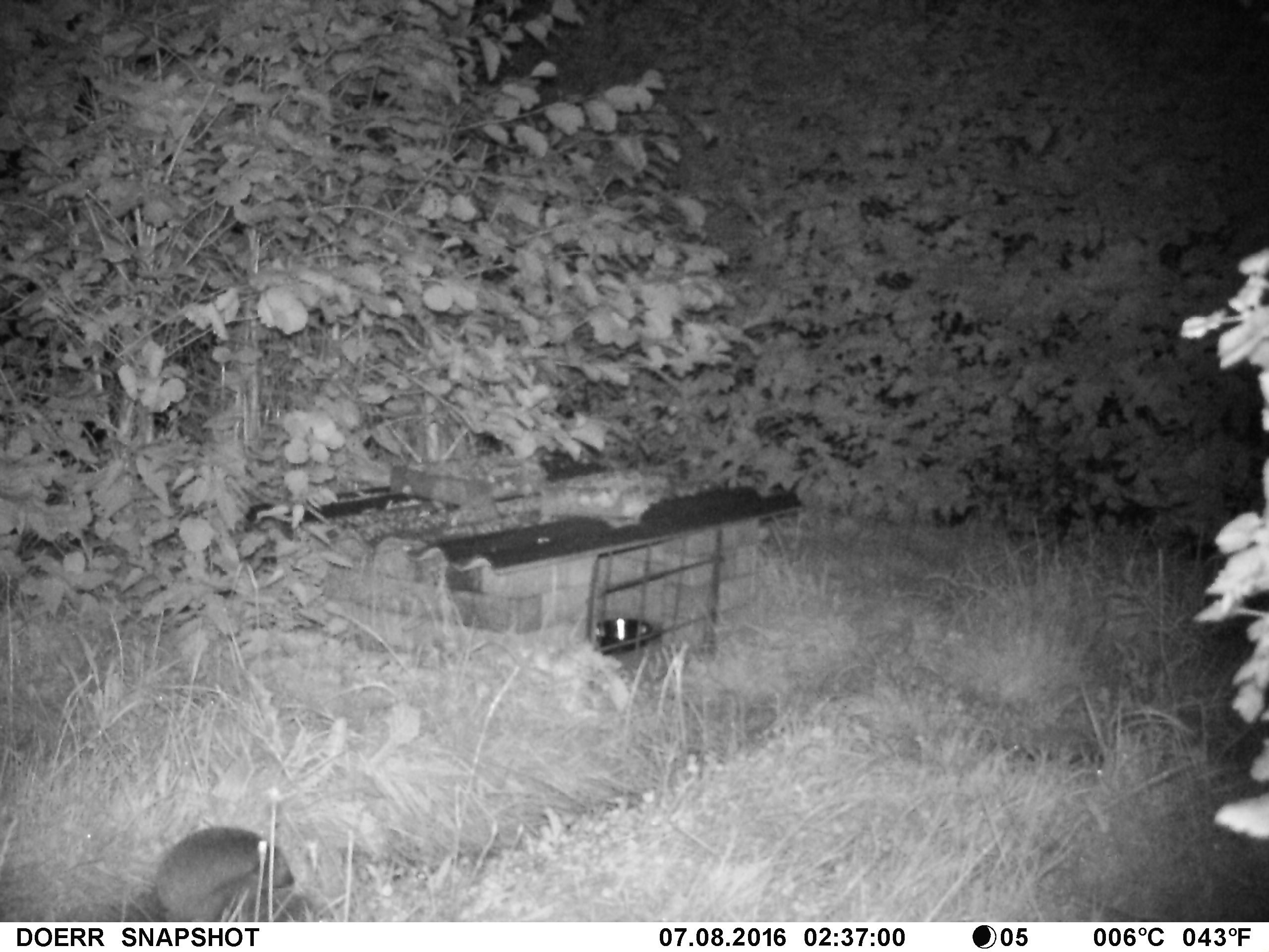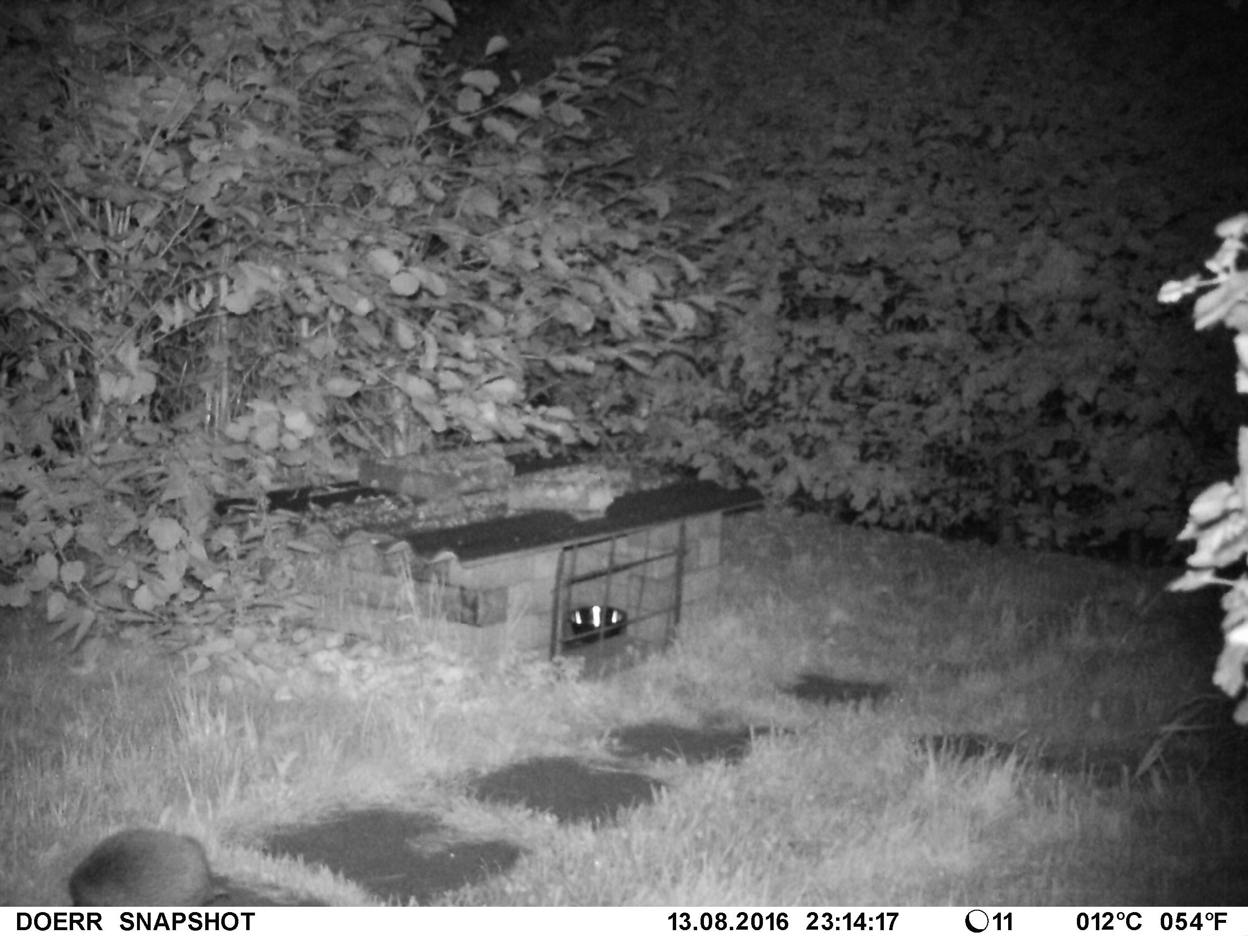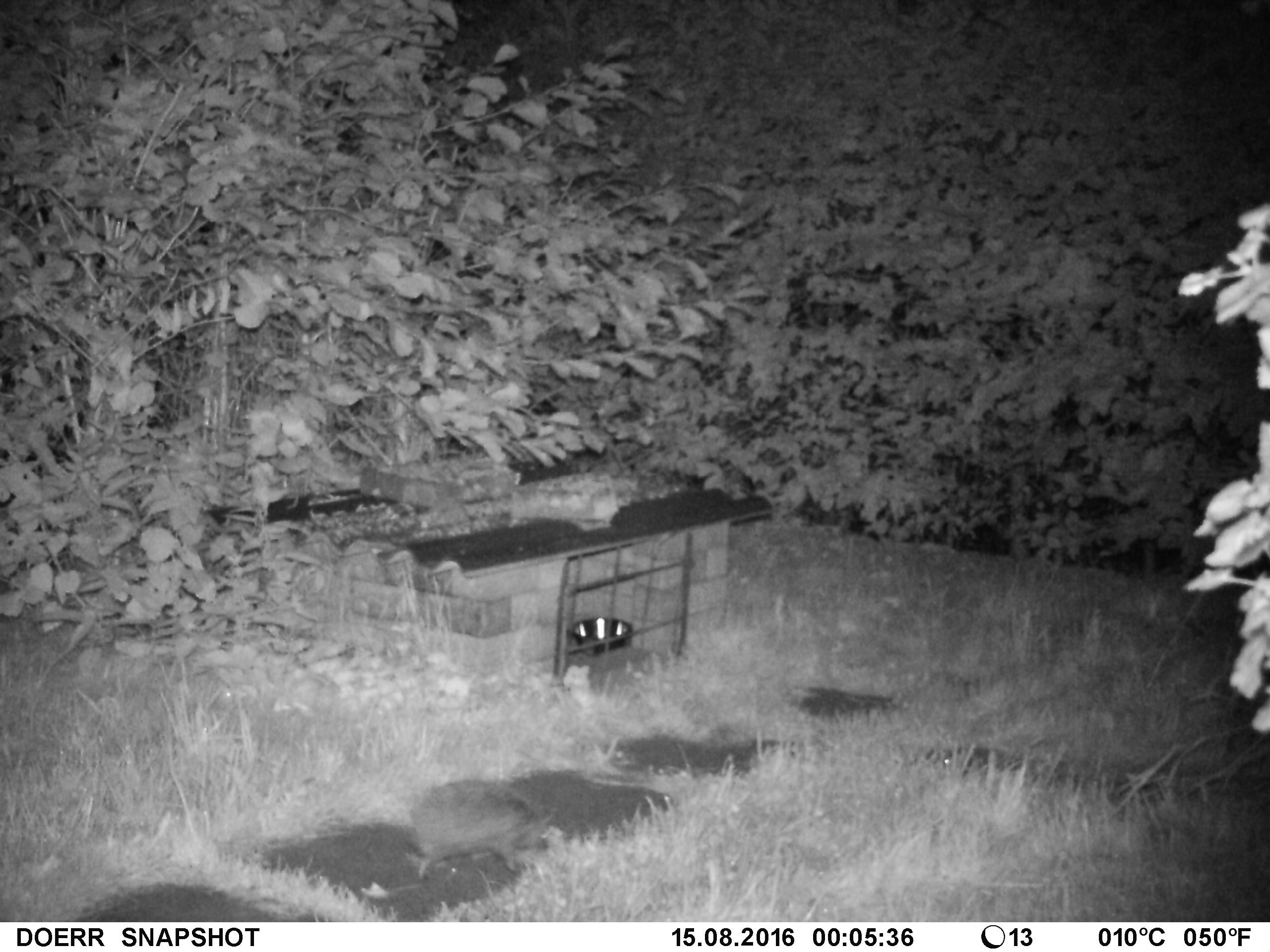 | Der Igel lebt offenbar unter dem Brennholzvorrat hinter dem Güterschuppen. Leider schmeißt das Tierchen immer alle Näpfe um und hinterläßt eine üble Sauerei. Liegt halt an seiner Größe. Er kann es nicht anders ... | Herr oder Frau Igel wurde übrigens im August 2016 fast jede Nacht hier fotografiert. | ||