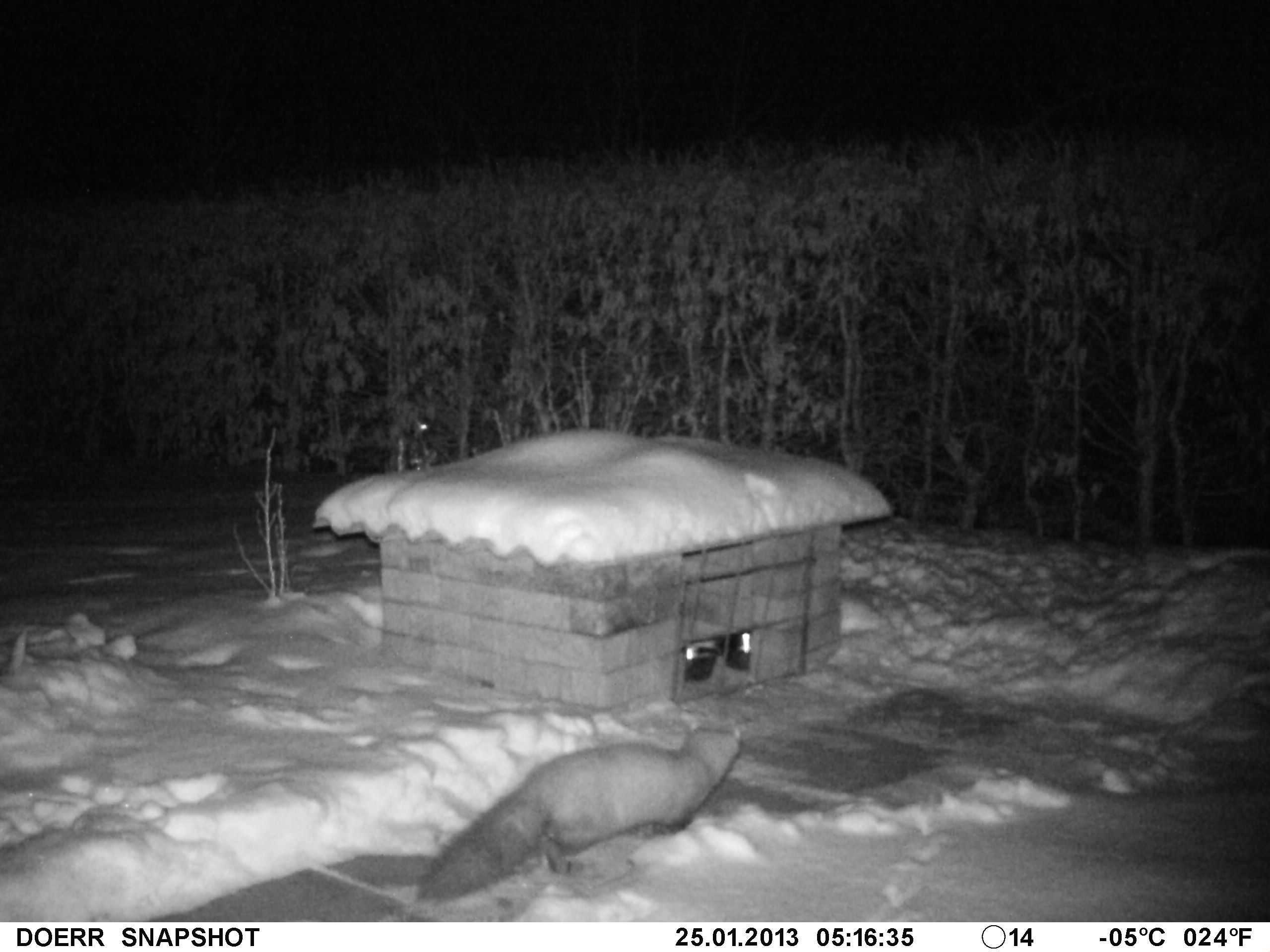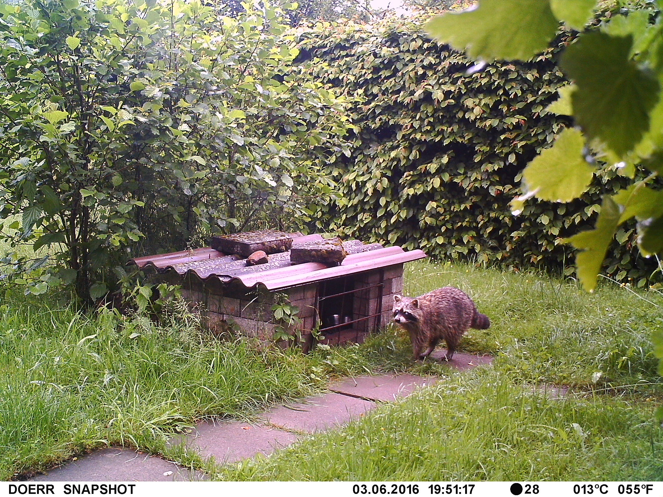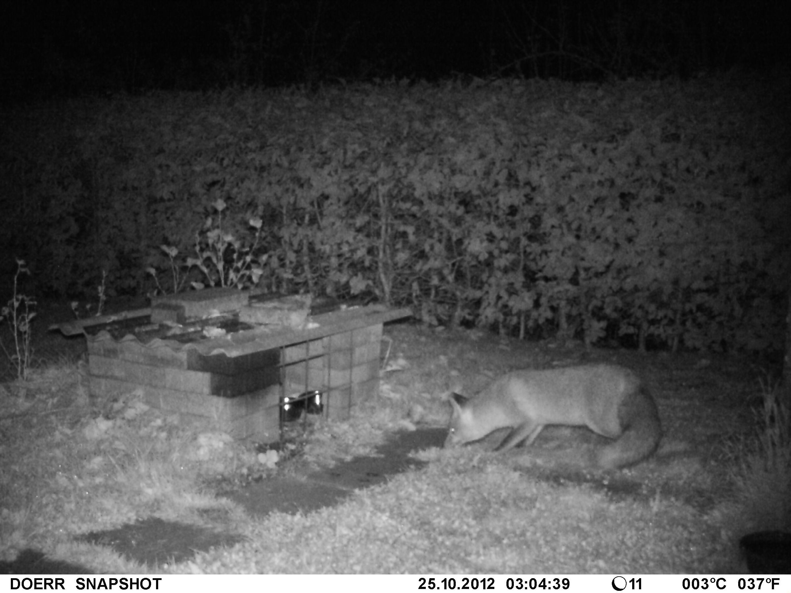 | Der Igel lebt offenbar unter dem Brennholzvorrat hinter dem Güterschuppen. Leider schmeißt das Tierchen immer alle Näpfe um und hinterläßt eine üble Sauerei. Liegt halt an seiner Größe. Er kann es nicht anders ... | Herr oder Frau Igel wurde übrigens im August 2016 fast jede Nacht hier fotografiert. | ||