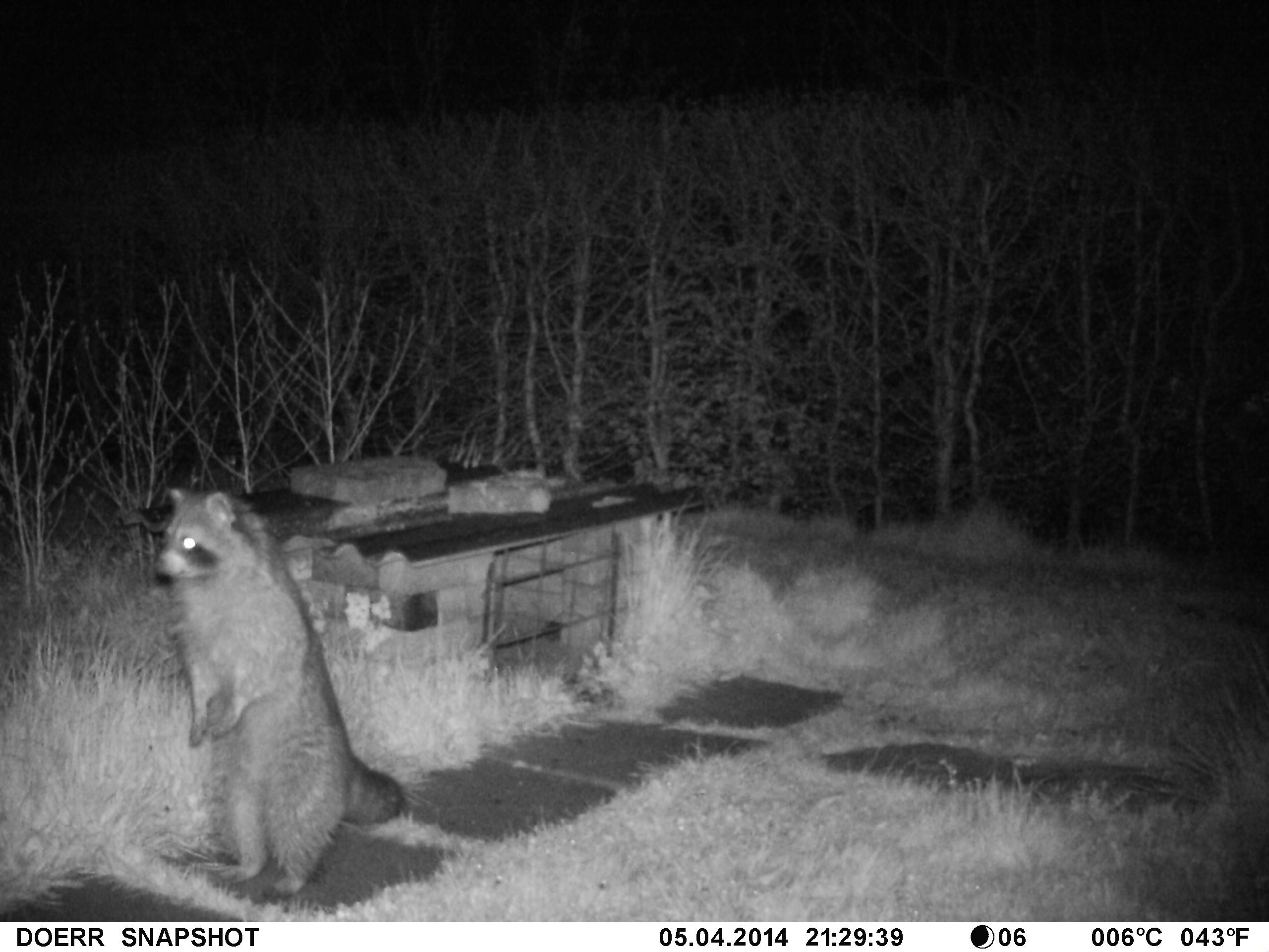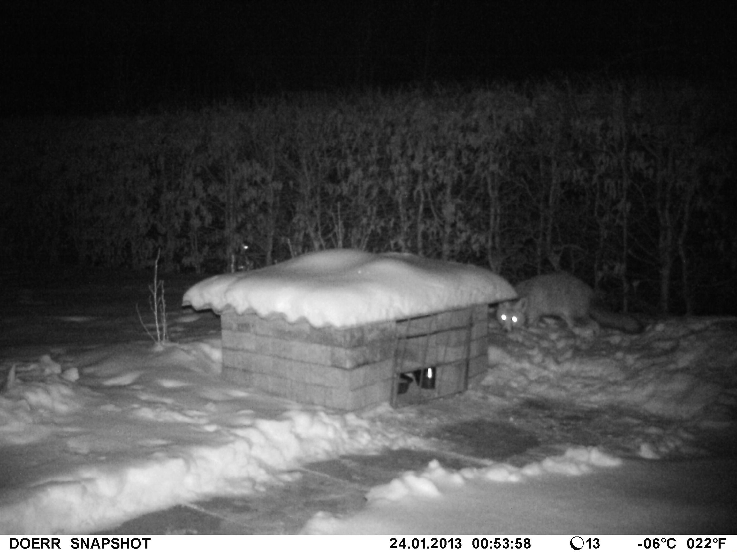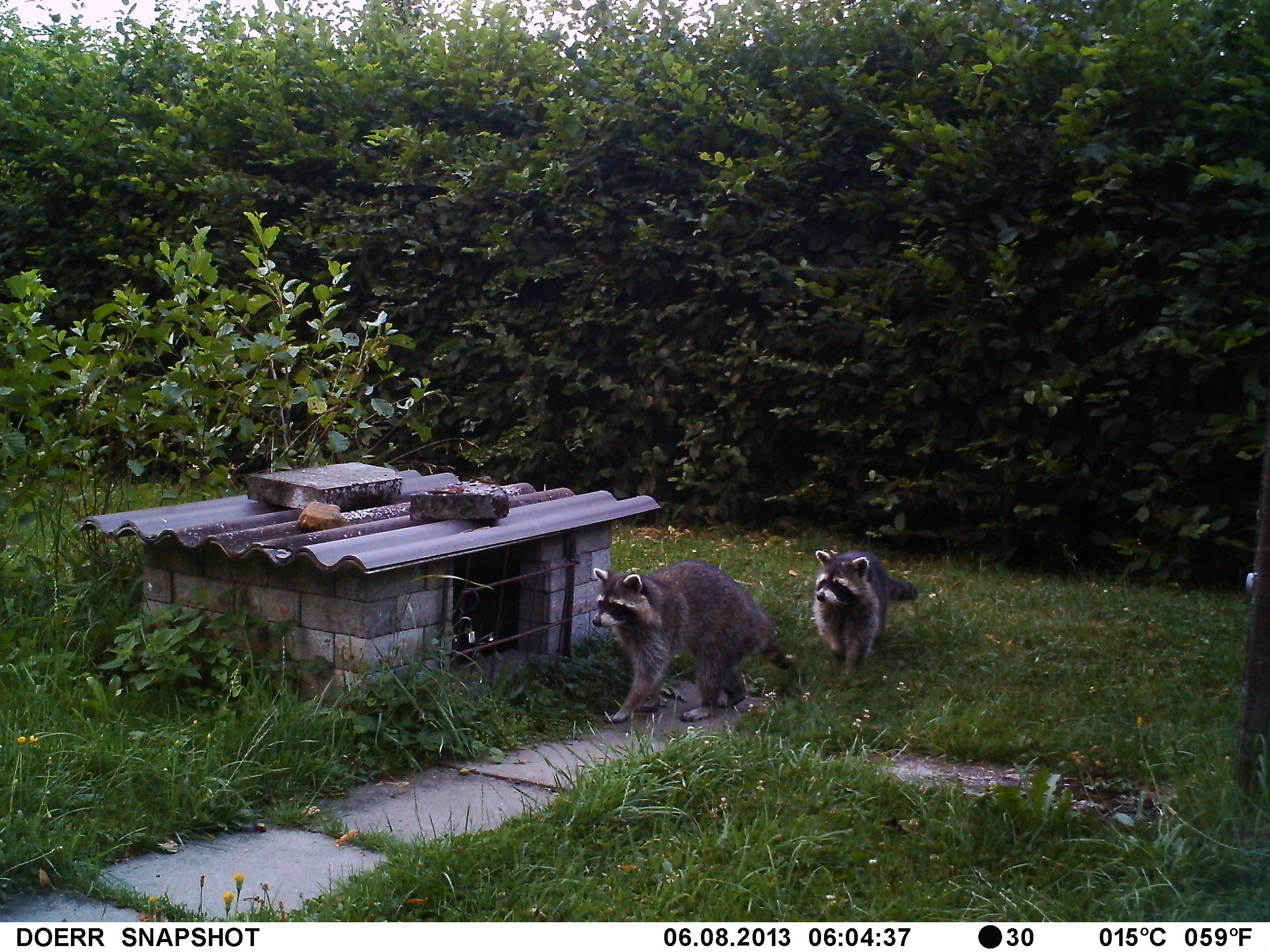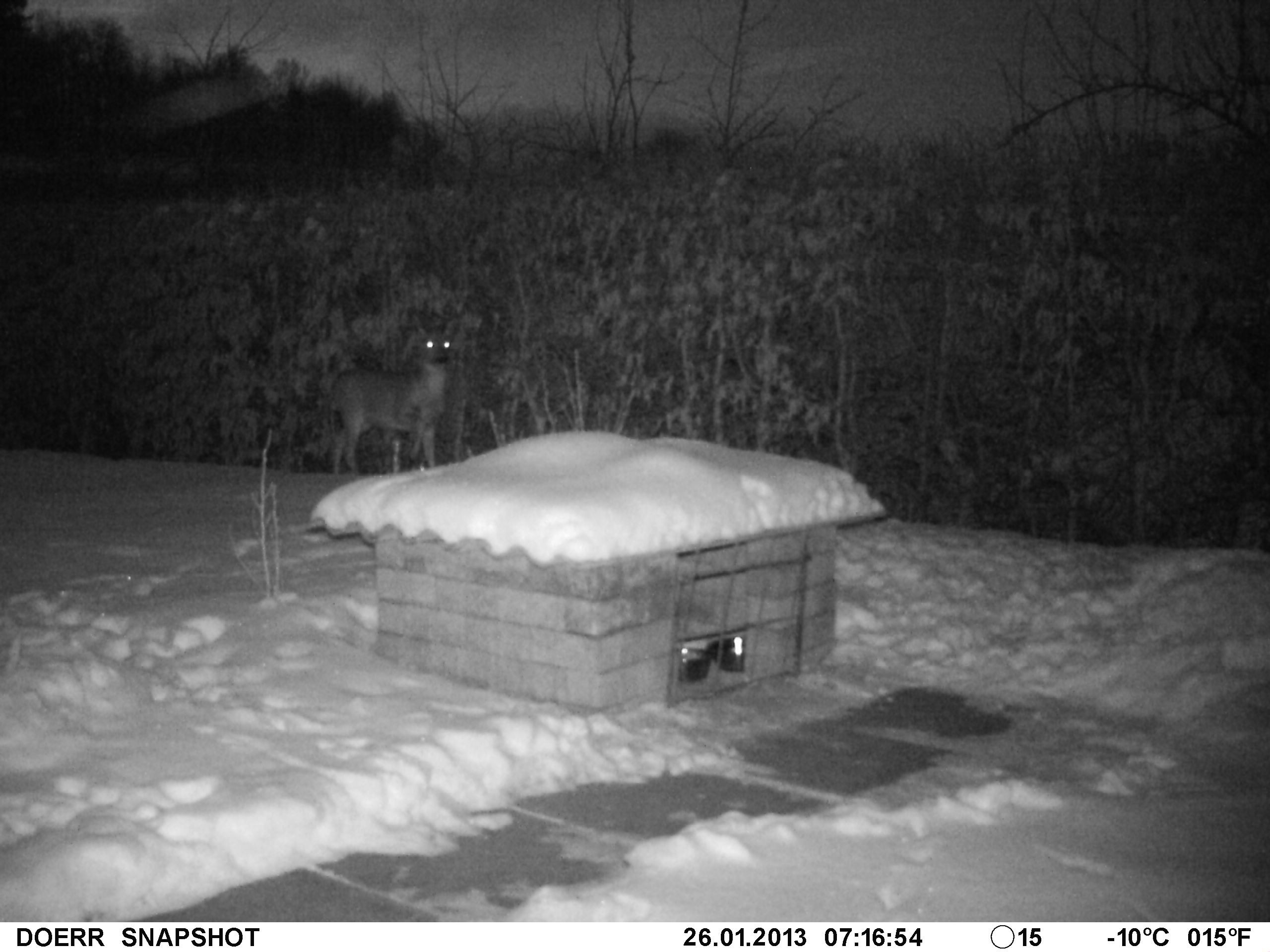 | Der Igel lebt offenbar unter dem Brennholzvorrat hinter dem Güterschuppen. Leider schmeißt das Tierchen immer alle Näpfe um und hinterläßt eine üble Sauerei. Liegt halt an seiner Größe. Er kann es nicht anders ... | Herr oder Frau Igel wurde übrigens im August 2016 fast jede Nacht hier fotografiert. | ||